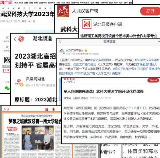 多渠道发力,线上宣传持续强化。积极进驻阳光高考平台、湖北招生信息网、广东招考在线、长江日报大武汉客户端等11个校外权威媒体平台开展线上咨询;借助央广网、中国交通广播、湖北广播电视台、湖北日报、长江日报、武汉广播电视台等主流媒体主动发声,开展高招直播,详细介绍和解读学校优势学科;结合当前学生群体特点,拍摄了1部MG动画、3部学院创意短视频,深受广大师生好评。