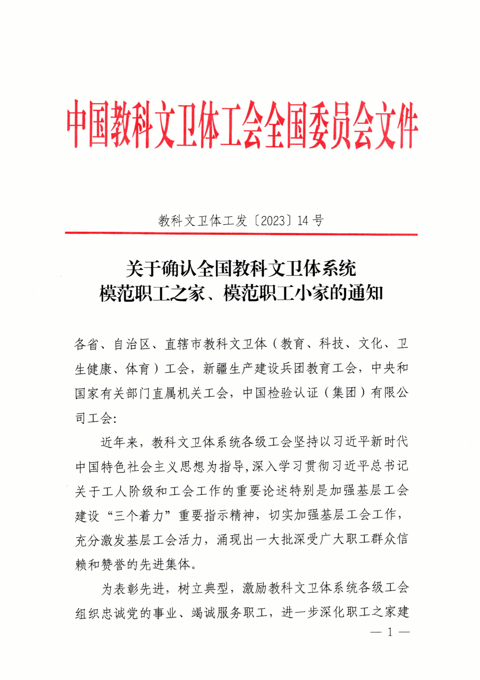 武科大网讯 8月28日,中国教科文卫体工会全国委员会印发了《关于确认全国教科文卫体系统模范职工之家、模范职工小家的通知》(教科文卫体工发〔2023 〕14号),我校工会获批全国教科文卫体系统模范职工之家。