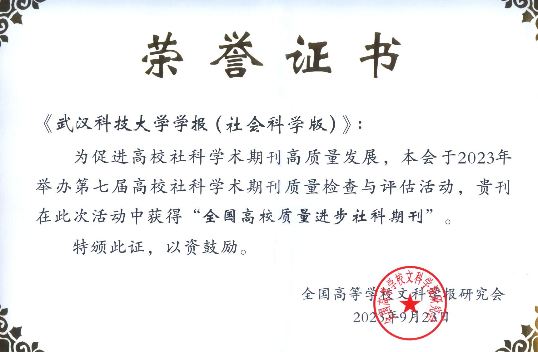 武科大网讯 9月23—24日,全国高等学校文科学报研究会九届三次理事会会议暨研究会成立35周年庆祝大会在湖北宜昌举行,会上公布了“第七届高校社科学术期刊质量检查与评估结果”,《国产亚洲精品久久久久久久_无码AV免费精品一区二区三区_99久久久无码国产精品免费人妻_精品人妻无码一区二区三区在线_无码专区久久综合久综合字幕_久久精品国产一区二区三区四区_真实一级一级一片免费视频_特级精品毛片免费观看_国产成人无码AA片免费看学报(社会科学版)》获评全国高校质量进步社科期刊。