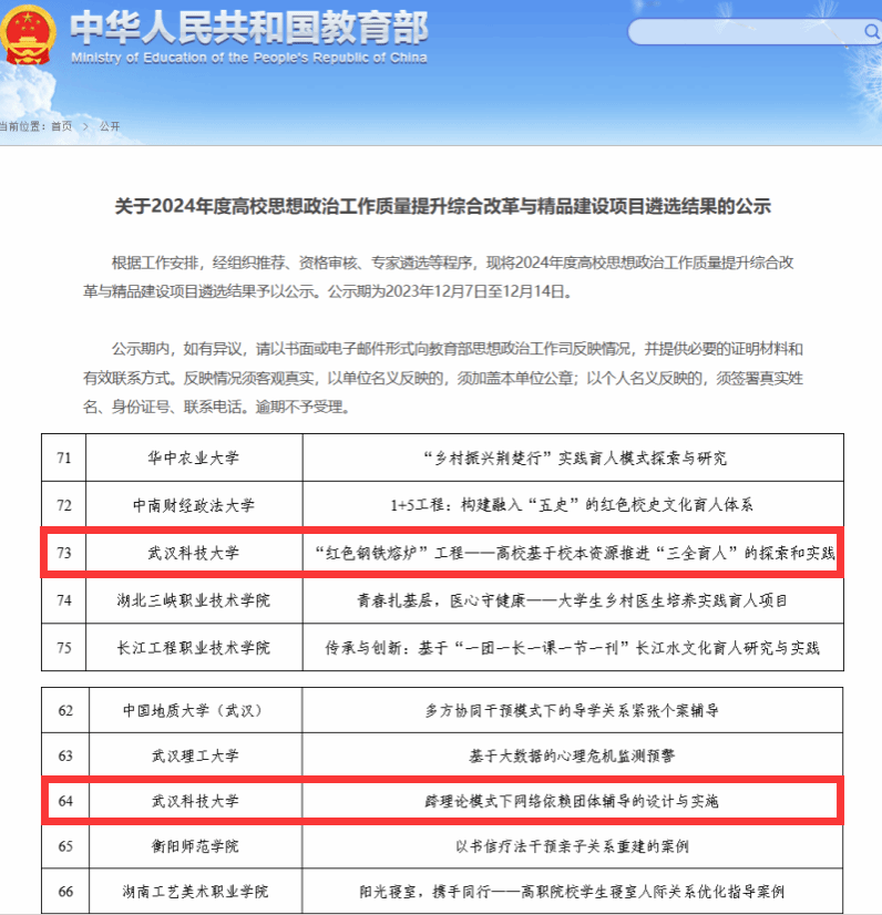 武科大网讯(通讯员潘鑫)近日,教育部公布2024年度高校思想政治工作质量提升综合改革与精品建设项目遴选结果,我校《红色钢铁熔炉工程——高校基于校本资源推进“三全育人”的探索和实践》和《跨理论模式下网络依赖团体辅导的设计与实施》入选。两项目均为湖北省属本科高校今年唯一入选课题,实现我校该项目零的突破。
