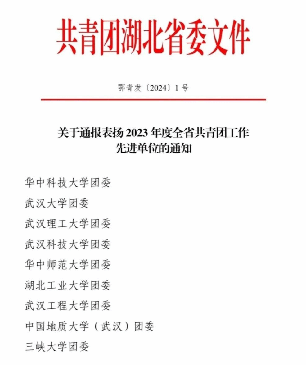 武科大网讯(记者陈雨璐)近日,共青团湖北省委发布了《关于通报表扬 2023年度全省共青团工作先进单位的通知》,我校团委获评“2023年度全省共青团工作先进单位”,考核成绩排名全省第4,位居湖北省属高校首位。