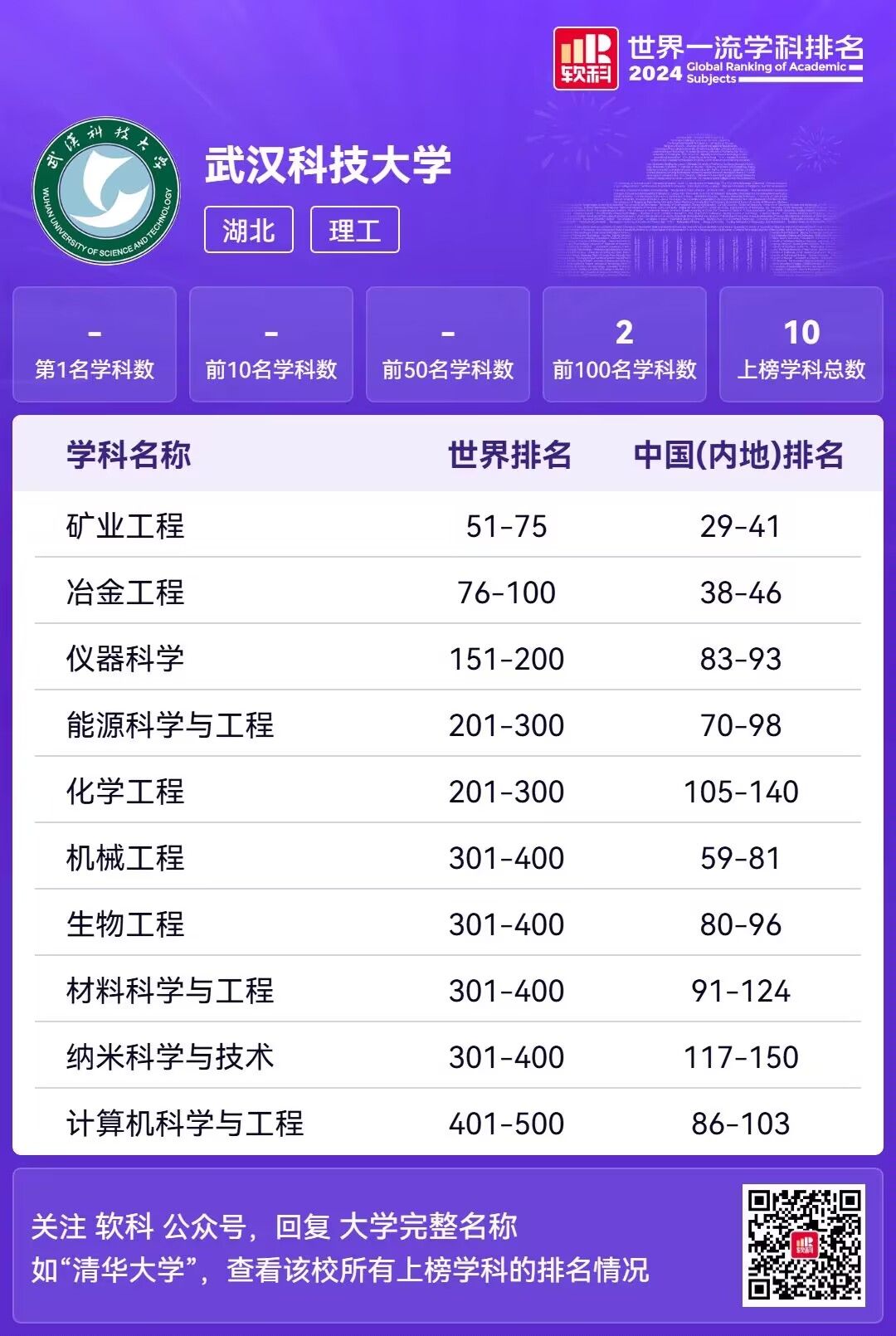 武科大网讯 11月11日,高等教育评价专业机构软科发布2024“世界一流学科排名”。我校10个学科上榜,居湖北省属高校第一。
