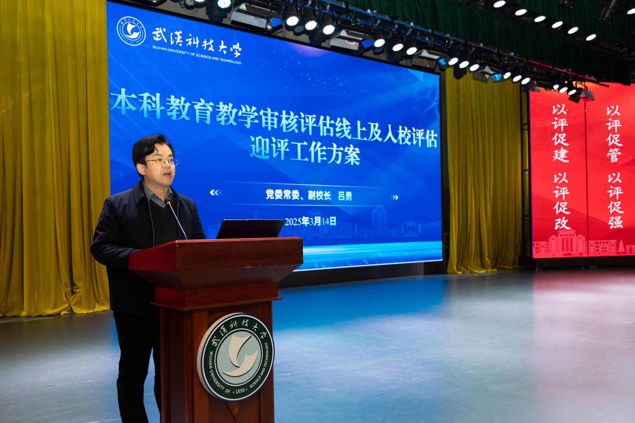 武科大网讯(通讯员邓小龙)3月14日,学校在青山校区碧园会堂召开本科教育教学审核评估迎评工作部署会,对决胜本科教育教学审核评估“攻坚战”再动员、再部署、再鼓劲。党委书记徐雁冰出席会议并讲话,校长倪红卫部署审核评估重点工作,副校长吕勇介绍迎评工作方案。会议由党委副书记孙国胜主持。