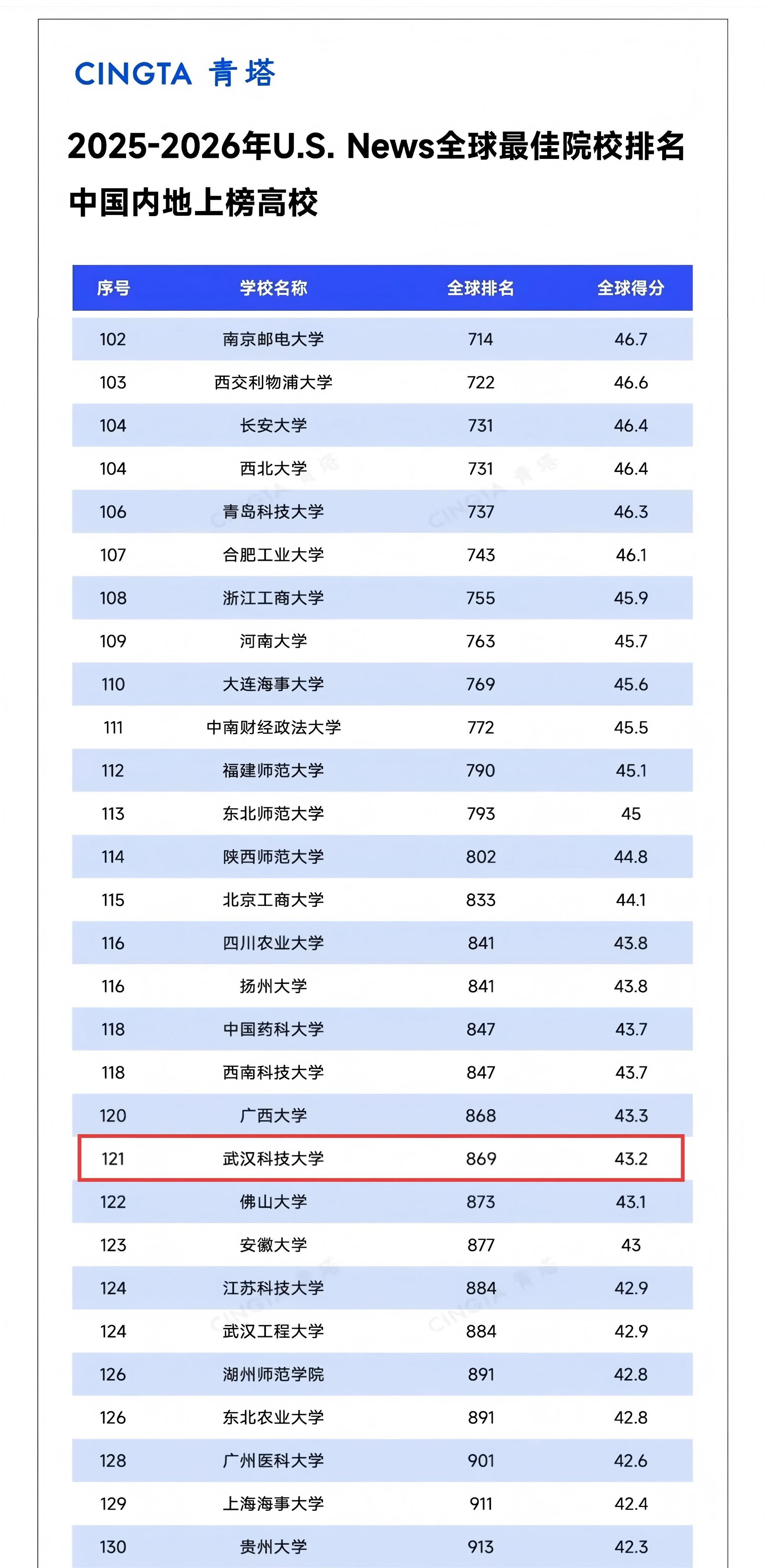 武科大网讯(记者周同江) 6月17日,U.S. News官网发布了2025-2026年度全球最佳院校排名,共有来自全球2250所高校上榜。榜单数据显示,我校位列全球第869、国内第121、湖北省属高校首位,全球排名较去年进步108个位次,国内排名进步8个位次。